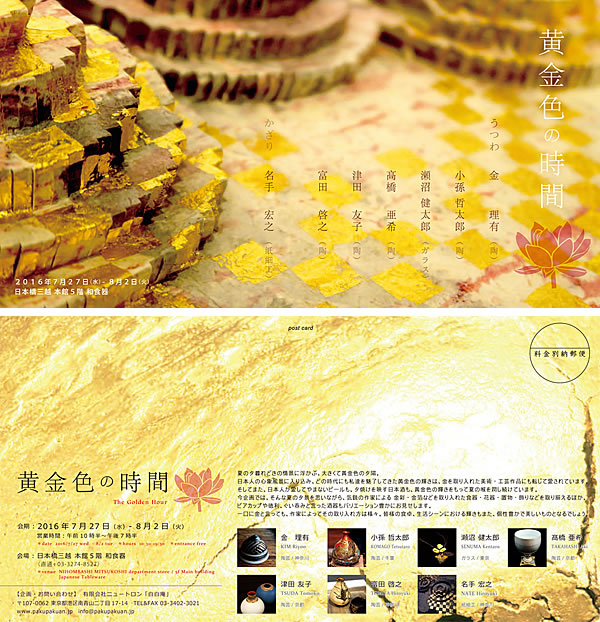 黄 金 色 は 幸 せ の 色 ・・・ 夏 の 夕 景 に 映 え る、 大 人 の た め の 華 や ぎ の 器 と 飾 り ![]() 夏の夕暮れどきの情景に浮かぶ、大きくて黄金色の夕陽。 日本人の心象風景に入り込み、どの時代にも私達を魅了してきた黄金色の輝きは、金を取り入れた美術 ・ 工芸作品にも転じて愛されています。 そしてまた、日本人が愛してやまないビールも、夕焼けを映す日本酒も、黄金色の輝きをもって夏の喉を潤し続けています。 今企画では、そんな夏の夕景を思いながら、気鋭の作家による 金彩 ・ 金箔などを取り入れた食器 ・ 花器 ・ 置物 ・ 飾りなどを取り揃えるほか、 ビアカップや徳利、ぐい呑みと言った酒器もバリエーション豊かにお見せします。 一口に金と言っても、作家によってその取り入れ方は様々。 皆様の食卓、生活シーンにおける輝きもまた、個性豊かで美しいものとなるでしょう。 [日 程] 2016年7月27日(水)~8月2日(火) [時 間] 午前10時半~午後7時半 [会 場] 日本橋三越 本館5階 和食器 直通 : 03-3274-8527 日本橋三越 本館5階 フロアガイド