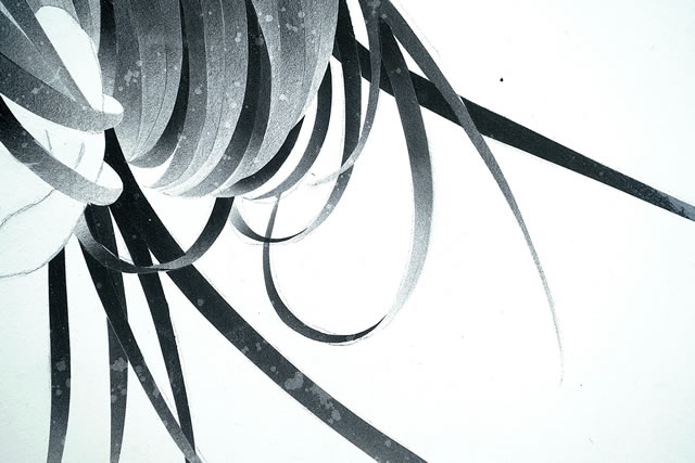 面相筆を用いて緻密な線を一本一本引くことで、