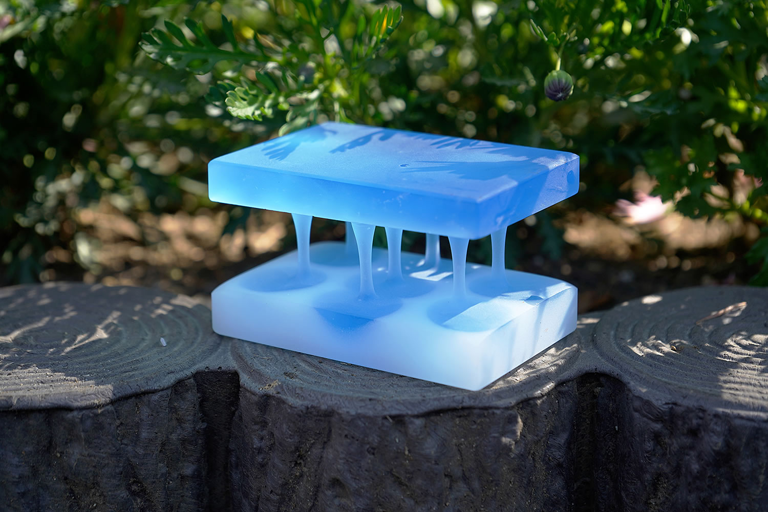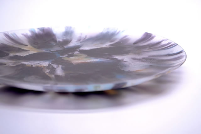吹きガラスとは異なり、石膏型にガラスの粒や粉を充填し、型ごと焼成する事で、微細な気泡が現出し美しく柔らかな表情を見せる。
