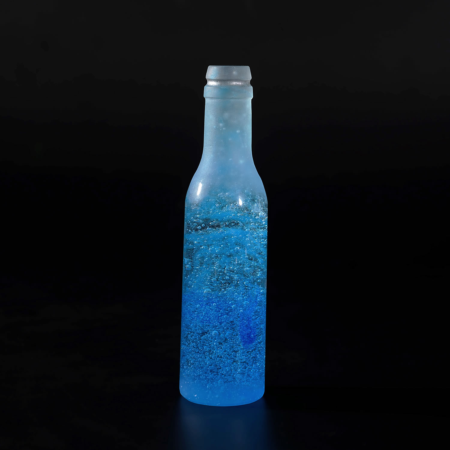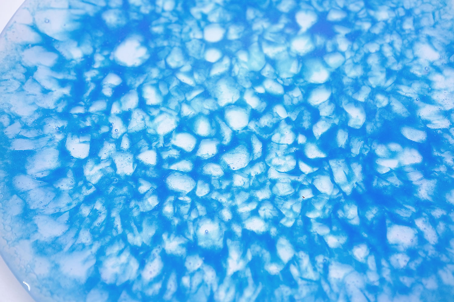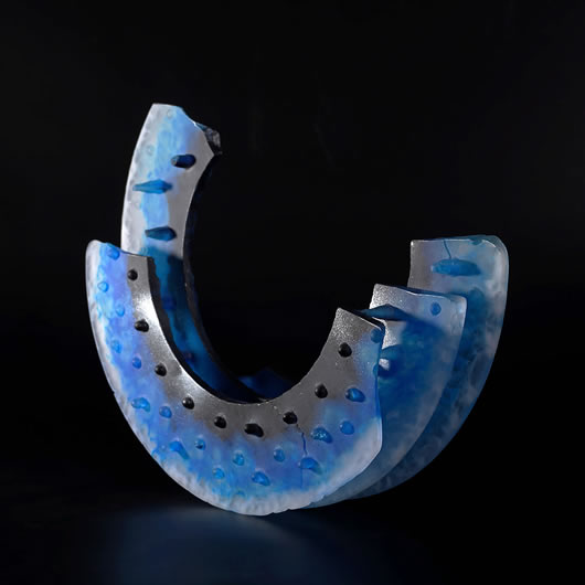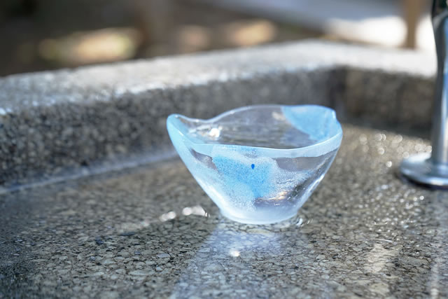 吹きガラスとは異なり、石膏型にガラスの粒や粉を充填し、型ごと焼成する事で、微細な気泡が現出し美しく柔らかな表情を見せる。